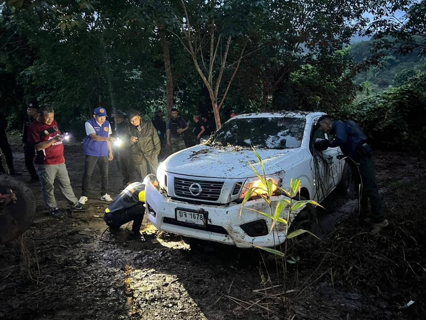 ต่อมาในเวลาประมาณ 02.00 น.วันเดียวกันเจ้าหน้าที่ได้ตรวจพบรถยนต์กระบะ ยี่ห้อนิสสัน 4 ประตู ป้ายทะเบียน จ.เชียงใหม่ ลักษณะต้องสงสัยขับไปบนถนนเลียบชายแดนไทย-สปป.ลาว ด้านหมู่บ้านเจดีย์ทอง หมู่ 21 ต.ปอ อ.เวียงแก่น จ.เชียงราย ซึ่งเจ้าหน้าที่ได้ตั้งจุดตรวจสกัดเอาไว้ ปรากฎว่าก่อนที่รถยนต์กระบะคันดังกล่าวจะถึงจุดตรวจประมาณ 100 เมตร ไม่กล้าขับผ่านจุดตรวจและจอดลงข้างทาง เมื่อเจ้าหน้าที่จะเข้าไปตรวจสอบและแจ้งให้สกัดด้านหลังเอาไว้ปรากฎว่าคนในรถได้เลี้ยวขับหลบหนีพุ่งเข้าไปในพงหญ้าข้างทางก่อนจะพากันเปิดประตูรถแล้วอาศัยความมืดวิ่งหลบหนีเข้าป่าไปได้